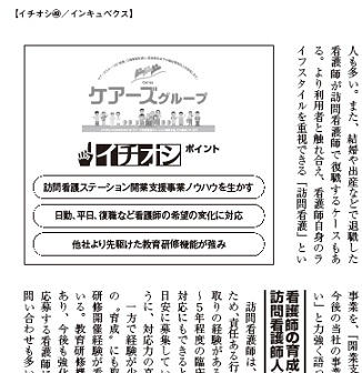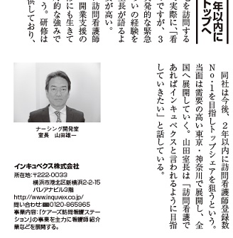 訪問看護ステーション開業支援のインキュベクス株式会社(本社:神奈川県横浜市、代表取締役:上村隆幸、代表取締役:上村隆雅)は、2014年3月1日に新事業部「ナーシング開発室」を発足させ、訪問看護を専門とした看護師の人材紹介サービスを本格的に開始しました。同サービスはこの度、人材ビジネス専門誌『月刊人材ビジネス』の取材を受け、5月号に記事が掲載されるなど注目を集めています。