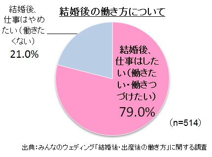「結婚後の、ご自身の【理想の働き方】について、あてはまるものをお選びください」という設問では、「結婚後、仕事はしたい(働きたい・働きつづけたい)」が79.0%、「結婚後、仕事はやめたい(働きたくない)」が21.0%となり、結婚後の就業意識の高さがうかがい知れる結果となりました。