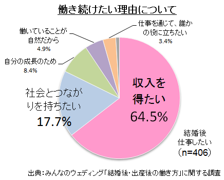 「結婚後、仕事をしたい(働き続けたい)方にお聞きします。その理由について、最もあてはまるものをお選びください。」という設問では、トップが「収入を得たい(64.5%)」となり、次に「社会とつながりを持ちたい(17.7%)」「自分の成長のため(8.4%)」が続きました。