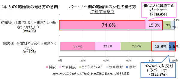 「あなたの結婚後の働き方について、【パートナーの方の意向】を教えてください。」という設問では、「結婚後、仕事はしたい(働きたい・働きつづけたい)」に賛同するパートナーの意向が、賛成/やや賛成を合わせて89.6%となり、パートナーの賛同が得られている傾向がうかがい知れたのに対し、「結婚後、仕事はやめたい(働きたくない)」については、反対/やや反対を合わせて19.5%となり、パートナーの賛同が得られにくい傾向がうかがい知れる結果となりました。