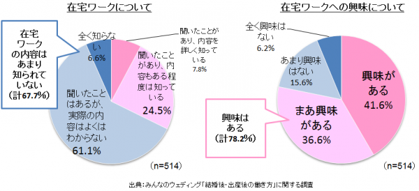 「在宅ワーク」についての設問では、「聞いたことはあるが、実際の内容はよくはわからない(61.1%)」「全く知らない(6.6%)」と合わせて67.7%の方がよくわからないと回答し、認知・理解が進んでないことがうかがい知れました。一方、「在宅ワークへの興味」についての設問では、「興味がある(41.6%)」「まあ興味がある(36.6%)」を合わせて、78.2%の方が興味があると回答し、認知・理解さておき「在宅ワーク」について興味・関心が高い傾向がうかがい知れる結果となりました。