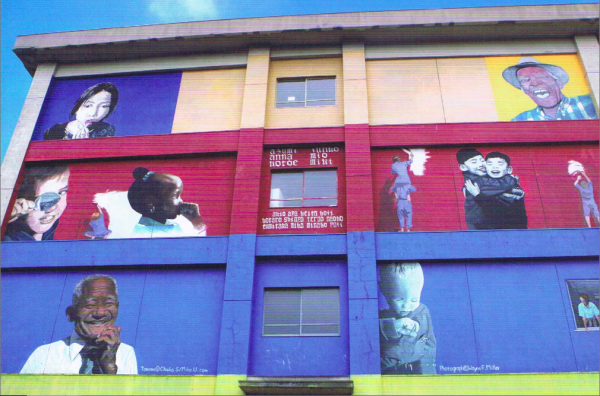 本校は、設立40周年を向かえ校舎老朽化に伴い旧校舎解体が決定となりました。旧校舎には、平成10年度より美術部や有志の手により100点以上の壁画が外壁や校舎内廊下に対して描かれております。