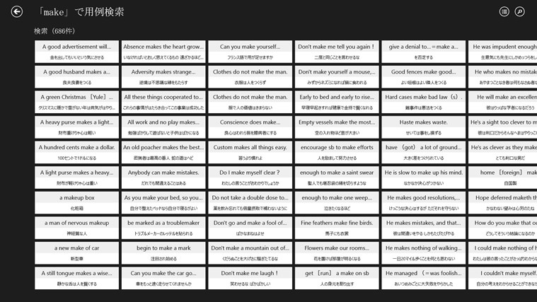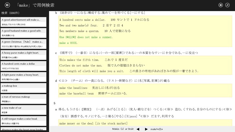・豊富な検索オプションを用意(前方一致 / 後方一致 / 完全一致 / 用例検索 / 成句検索 / 全文検索)それぞれの検索方法で、文字を入力すると候補見出し語が表示されるインクリメンタルサーチに対応(用例検索 / 成句検索 / 全文検索を除く)。用語をうろ覚えでも検索が容易です?