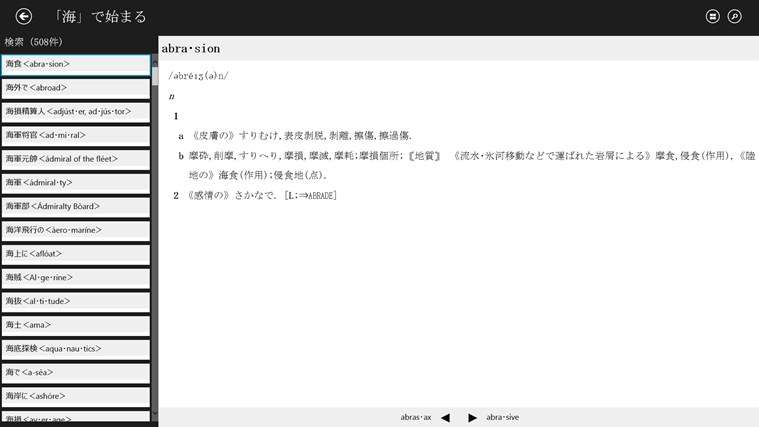 ・単語検索で日本語/カタカナを入力すると, それを訳語に持つ項目を検索することができます