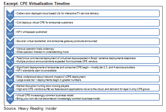 Virtual CPE: Virtually Ready to Cut Costs, Drive Revenue & Disenfranchise Vendors looks at the state of development of CPE virtualization, reviewing latest thinking about what can be virtualized, how CPE might evolve and who is making the early running. It also profiles nine leading vendors in the virtual CPE market.
