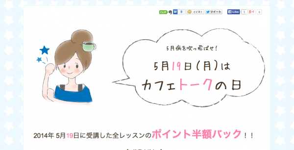 受講したレッスン料が半額ポイントバックされる「サービスデー」として定着しました19日の「カフェトークの日」。5月病も吹き飛ばす元気をお届けする気持ちで、ユーザー様のオンライン学習を応援します。