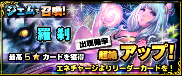 イベントガチャとは、通常より高確率でレアカードが出現し、さらには限定カードが入っているガチャとなります。今回の限定カードは、Eリーダーカードの「羅刹」が当たります。