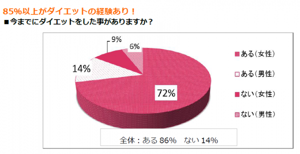 アンケートの結果、85%以上が「ダイエットしたことがある」と回答ました。回答者を女性のみに絞り込むと、およそ90%の女性がありと回答しました。