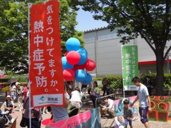 熱中症弱者である子どもは、遊びに夢中になって水分補給を忘れがち!そんな子ども達や親に、環境省の「気をつけよう熱中症予防」と記載されたのぼりを会場内に設置し、またスタッフが子ども達に声かけをする事によって熱中症予防の啓発を行いました。