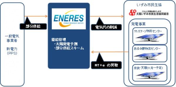 株式会社エナリスは買い取った電気を、いずみ市民生協の各施設に供給します。このとりくみは、いずみ市民生協が発電した再生可能エネルギーについて、部分供給制度を活用することにより、いずみ市民生協の各施設にて利用するもので、近畿地区では需要家側が主導となってすすめる先進的なとりくみとなります。
