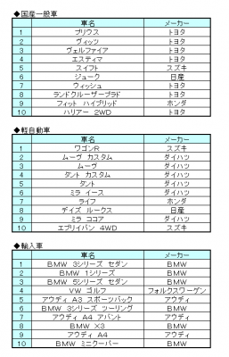 国産一般車部門は、先月に引き続きプリウス(トヨタ)が首位に。更に、半数以上をトヨタ車が占める結果となりました。