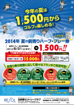 ゴルフ場やホテル・旅館などの運営や運営受託&支援を介し、リゾートの再生と活性化を推進するリゾートソリューション株式会社(略称:リソル、東京都新宿区、多賀道正社長)の直営ゴルフ場のひとつ「北武蔵カントリークラブ」(埼玉県本庄市)では、6月~8月の夏のゴルフシーズンへ向けて、「1,500円からゴルフが楽しめる」という夏だけのお得な『2014年・夏の前売りハーフ・プレー券』を企画しました。