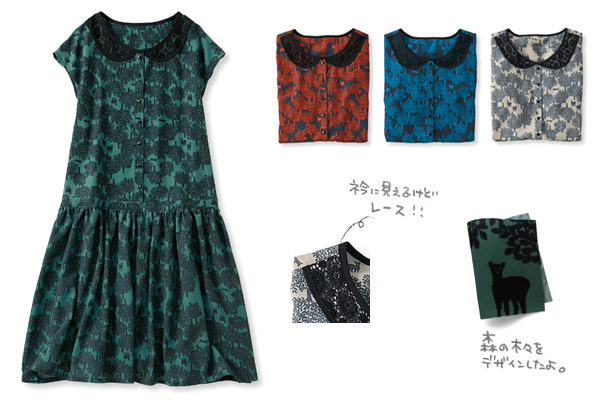 ローウエストがクラシカルでおすまし気分のワンピース。つるんとしたデシンという素材が、きれいめな雰囲気を演出。衿に見えるのは、縫い付けたレースです。膝丈まであるので、大人っぽくも着られます。よく見るといろいろな動物があちこちに隠れています。夏のおめかしにおすすめです。