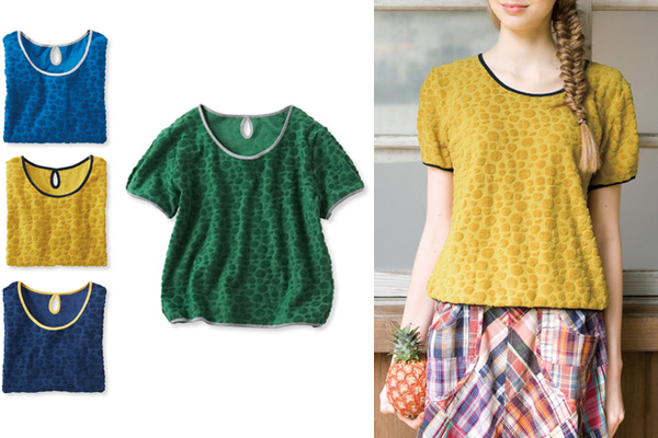 ちょっぴり懐かしさも感じさせるポコポコしたパイル素材のトップス。大小の水玉柄がとても涼しげでかわいい1枚です。