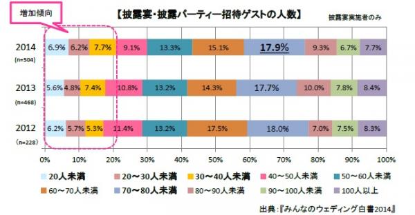 「披露宴・披露パーティーの招待ゲストの人数」は、2013年に引き続き「70~80人未満(17.9%)」が第1位となりました。過去3年のデータを比較したところ、招待人数が40人未満の少人数婚が増加傾向にあることがわかりました。