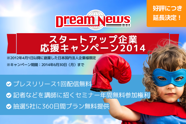 プレスリリース配信代行サービス『ドリームニュース』(http://www.dreamnews.jp)は、創業が2012年4月以降の法人企業を対象とし、2014年4月1日~5月31日の期間でプレスリリースを1回無料で配信出来る『スタートアップ企業応援キャンペーン2014』(http://www.dreamnews.jp/campaign/startup_campaign20142.html)を好評につき2014年6月30日まで延長致します。