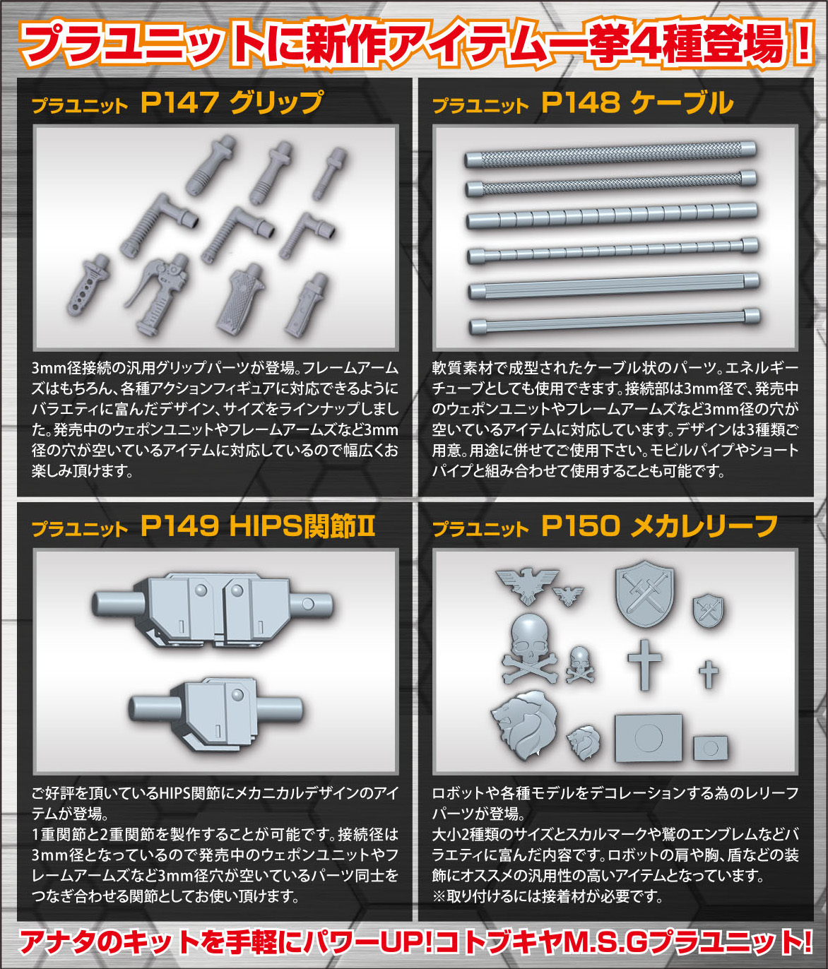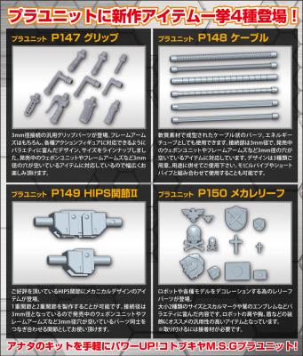 株式会社壽屋(本社:東京都立川市曙町/ 代表:清水一行)は、M.S.Gシリーズから、プラモデルやフィギュアの改造・ディテールアップに便利な「プラユニット」4種類(グリップ、ケーブル、関節、レリーフ)を2014年9月発売予定です。