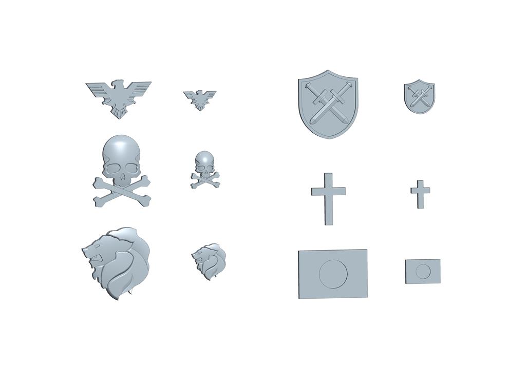 ロボットや各種モデルをデコレーションする為のレリーフパーツ。大小2種類のサイズと各種エンブレムなどバラエティに富んだ内容です。ロボットの装飾にオススメの汎用性の高いアイテムとなっています。※取り付けるには接着材が必要です。