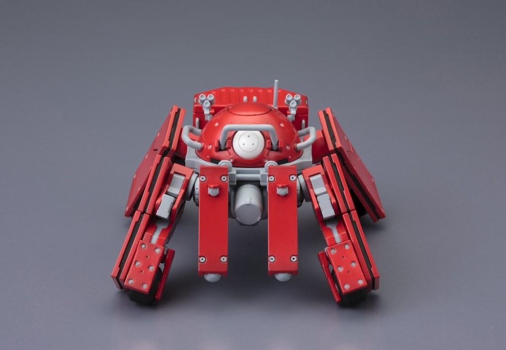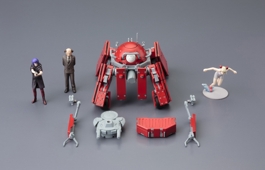 腕部は差し替えによってマニピュレーターの展開を、脚部は特徴的な可動ギミックで、人や車を飛び越えるシチュエーションも再現できます。アンカー発射装置は1門のタイプと3門のタイプが付属し、機体下面にはガトリングガンを取り付けることができます。また、付属品として[草薙素子・荒巻大輔・自走地雷]の未塗装組立式フィギュアも付いてくる満足度の高いキットとなっています。塗装派でない方も組み立てるだけで『攻殻機動隊ARISE』の世界をお楽しみ頂けます。