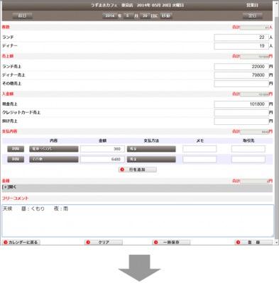 日計表メール通知機能は、メールアドレスを設定すると、日計表登録時に、一日の来店客数や売上、経費、コメントなどがメールで通知される機能です。