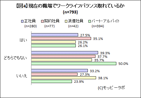 図表参照:【図4】現在の職場でワークライフバランスは取れているか(n=793/雇用形態別)