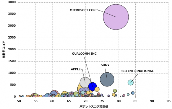 3位 APPLEはモーションセンサーの開発を手がけるPrimeSense(イスラエル)を買収するなど、MICROSOFTと同様に他社技術の調達により競争力の強化を図っています。主にジェスチャーをとらえるためのユーザーインターフェイスに関する技術に強みが見られます。
