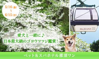 ホテルから車で約20分に位置する「那須ゴンドラ」。愛犬と一緒に乗り込み、その山頂駅を降りると、一帯には枝先に五葉をつけた純白の「ゴヨウツツジ」が国内最大級の約3万本も咲き誇っています。ゴヨウツツジ遊歩道は一周約45分。那須の山々や野鳥の声など自然とふれあいながら、ワンちゃんと一緒に体験する思い出の旅を楽しむプランとなっています。