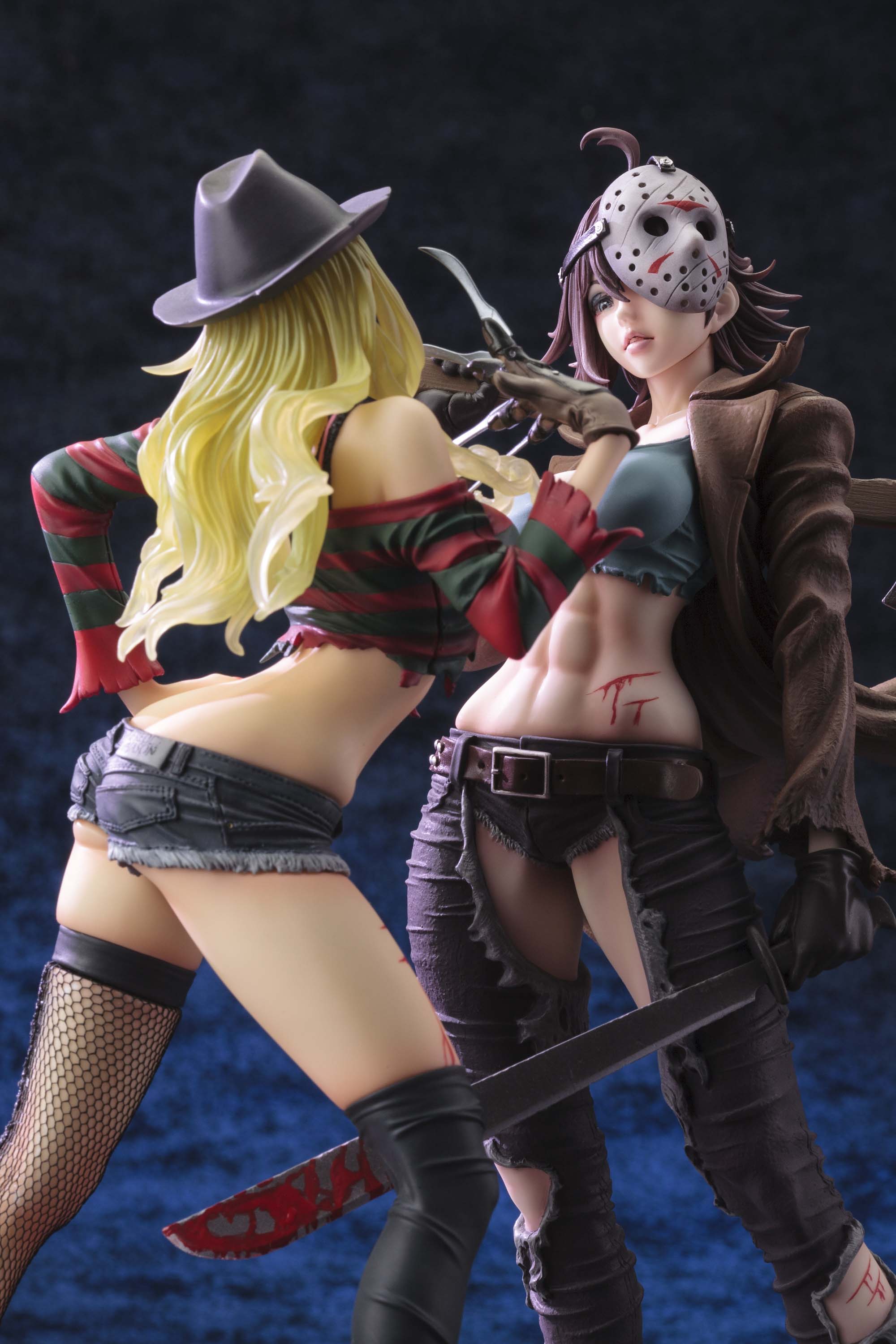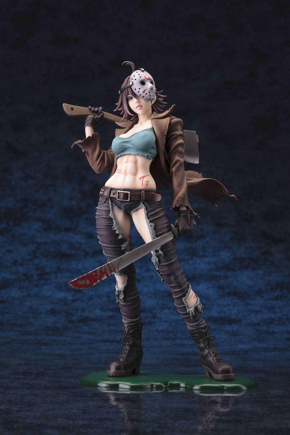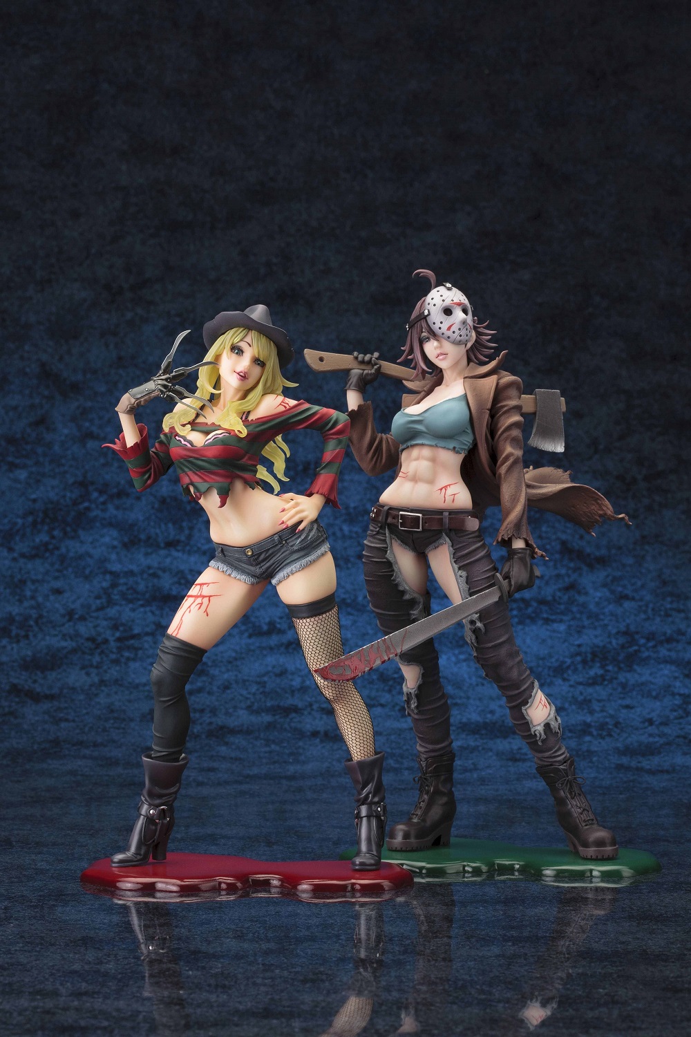 ジェイソンの特徴的なホッケーマスクは勿論の事、両手に持った斧や鉈、力強く割れた腹筋にもパワフルな魅力あふれる一品となっています。クリスタル・レイクの湖畔の水溜りをイメージしたベースはメタルプレート仕様で、フィギュア本体足裏のマグネットによりお好みのディスプレイが可能です。10月のハロウィンには、2体揃えて”美少女版”『フレディVSジェイソン』をお楽しみ下さい。
