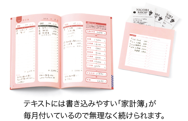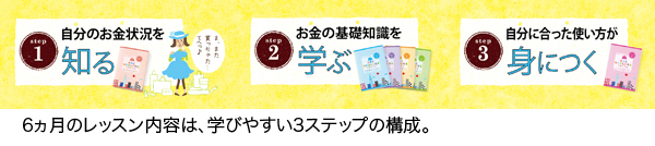 「保険ってどうしたらいいの」「知らないうちに財布が空っぽ」「なんとなくお金を使ってきた」などの悩みを解消し、お金の基礎知識が学べて、無理のないお金との付き合い方が身につくよう開発した、フェリシモオリジナルのレッスンプログラムです。毎月1冊ずつ届くテキストブックで、自分に合ったお金との付き合い方を習得します。6カ月のプログラムは(1)自分のお金状況を知る、(2)お金の基礎知識を学ぶ、(3)自分に合った付き合い方を見つける、という続けやすい3ステップです。シンプルで簡単な家計簿ページに書き込むことで、自分の収支バランスも一目瞭然になります。レシートを入れておける便利な「レシート袋」や、自分の将来プランを考えるきっかけになる「人生設計シート」もセットでお届けします。