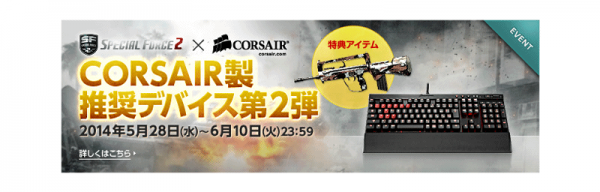 スペシャルフォース2は、NHN PlayArt 株式会社が運営提供するオンラインFPSゲームです。2014年5月28日よりスペシャルフォース2推奨デバイスとして認定されたCorsair ゲーミングデバイス、CORSAIR Gaming Keyboards Vengeance K70 Blue SF2の発売を開始します。スペシャルフォース2推奨デバイス認定に伴い、初回数量限定でゲーム内で使用できる特典アイテム「FAMAS Generic (永久)」を同梱いたします。