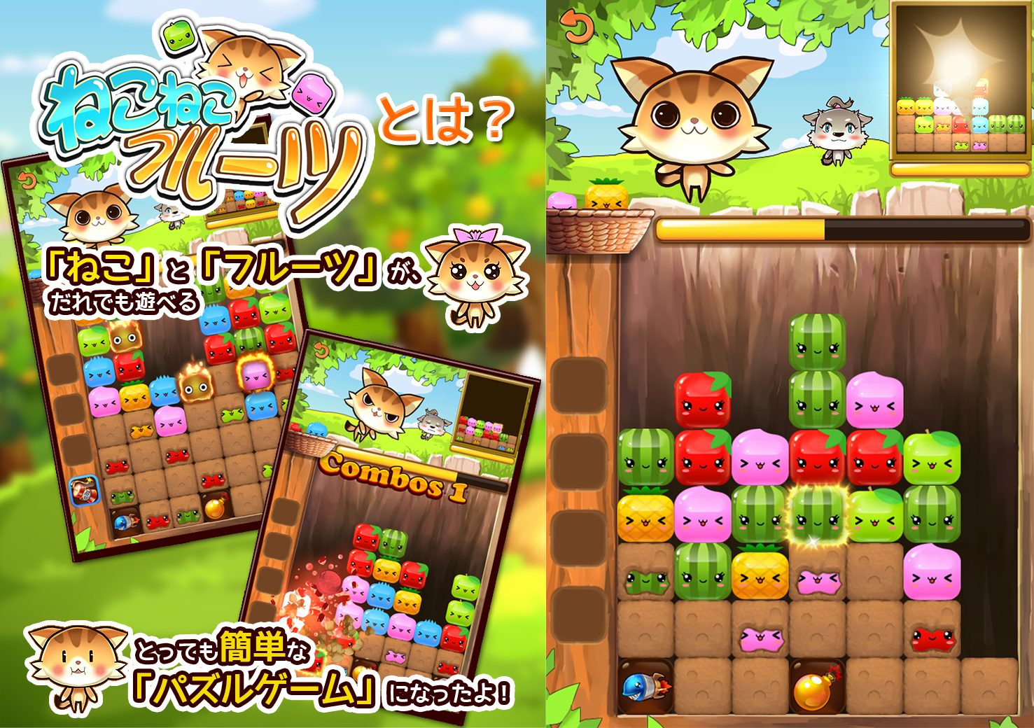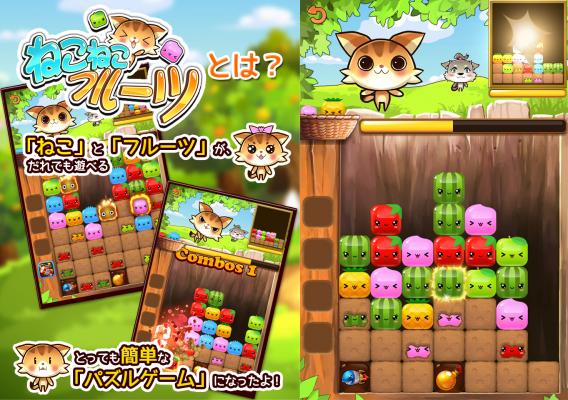 【ねこねこフルーツ♪】とは、かわいい「ねこ」と「フルーツ」でデザインされた世界観で繰り広げられる、誰でも遊べて、脳活もできるパズルゲームです。