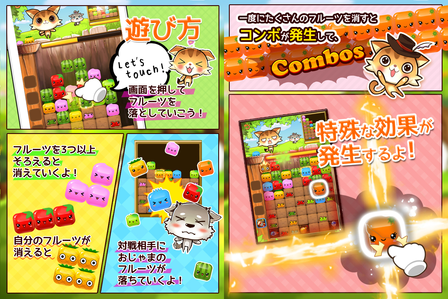 画面をタップしてフルーツを落としていきます。フルーツは3つ以上そろえると消えます。消えたフルーツは、対戦相手に「おじゃま」のフルーツとして落ちていきます。どんどんフルーツを消して、対戦相手の画面をフルーツでいっぱいにすると勝利です。