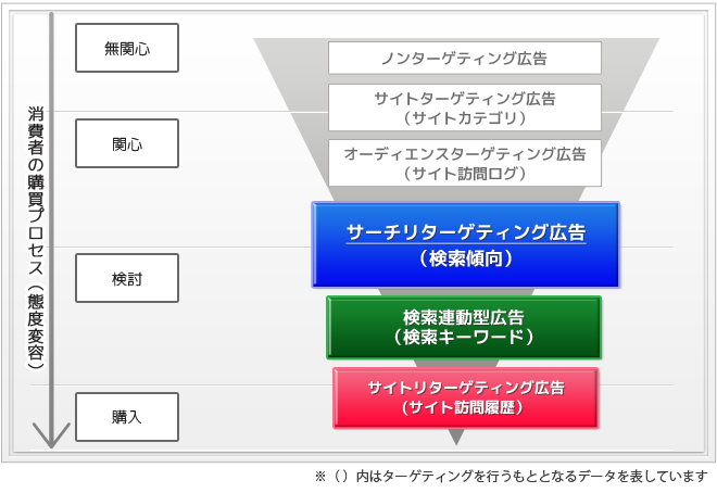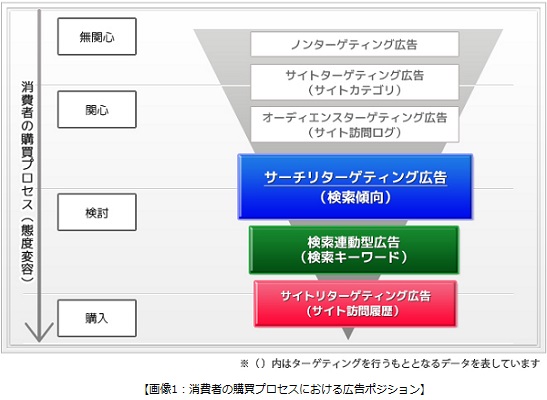 これにより、レモーラリスティングは、広告主様の商材に対して興味関心が顕在化しているユーザー層から、まだ顕在化していない潜在層に至るまで、「検索連動型広告」「サーチリターゲティング広告」「サイトリターゲティング広告」を組み合わせることで、見込み客への包括的なアプローチが可能となりました。
