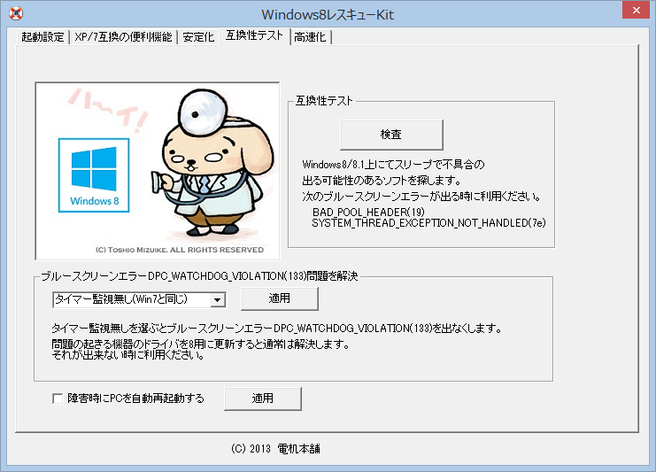 2. Windows8で起きやすいブルースクリーンエラーDPC_WATCHDOG_VIOLATION(0x133)の回避機能実装。