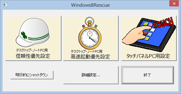 「Windows8レスキューキット」Ver1.6.1より簡単設定画面を実装。事前に用意した3つのボタンを押すだけで操作できます。
