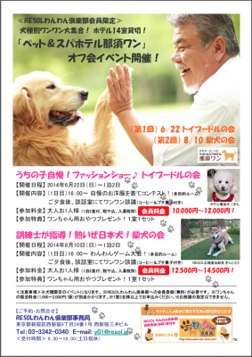 この企画は、リソルが昨年の4月から募集を開始した「RESOLわんわん倶楽部」会員(現在登録会員数は、約1,200家族)を対象に開催する犬種別ワンワン大集合イベント。8月10日には同様な犬種別イベント「柴犬の会」開催も予定しています。