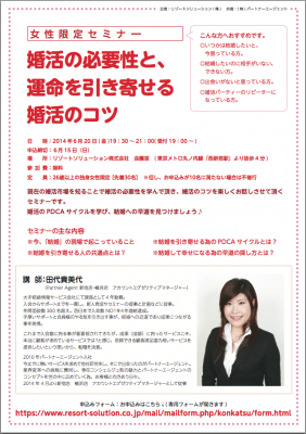 以上、ご興味がある方はぜひご参加ください。ただし、26歳以上の独身女性限定のセミナーです。開催時間は19時30分~21時の予定。定員は30名。参加費は無料です。