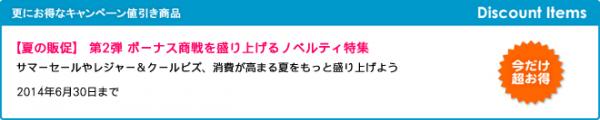 販促ノベルティ卸売りセンターでは、通常の卸売価格よりも更にお得な!値引きキャンペーンを期間限定で開催します。是非、お得なこの機会に名入れノベルティをご検討ください。お得な値引き期間は、2014年6月30日まで。