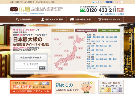 鎌倉新書が運営する『いい仏壇』は、日本最大級の全国8000店以上の仏壇店情報を掲載し、お得に仏壇を購入できるクーポン発行や、ご購入者への最大10万円のギフトカードプレゼントなどを実施している、仏壇の情報検索ポータルサイトです。