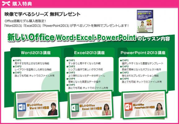 本キャンペーンでは、今年の春に発売された最新バージョンの「Microsoft(R) Office Personal 2013」をプリインストールしたデスクトップパソコンとノートパソコンを購入された先着300名様に、「Word2013」「Excel2013」「PowerPoint2013」のレッスン内容をおさめた“映像で学べるシリーズ”ソフトを無料プレゼントいたします。