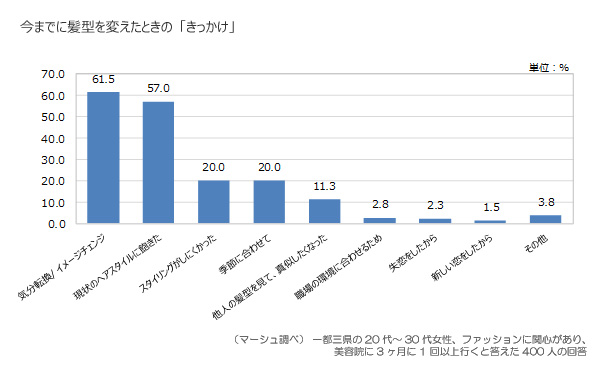 髪型を変える「きっかけ」を尋ねたところ、失恋をしてヘアスタイルを変えた経験がある人は、僅か2.3%に留まり、「失恋をした女性が髪を切って思いを断つ」という風説とは大きく異なる結果となりました。実際は、「イメチェン/気分転換」、「現状のヘアスタイルに飽きた」がヘアスタイルを変える理由の大半を占めています。