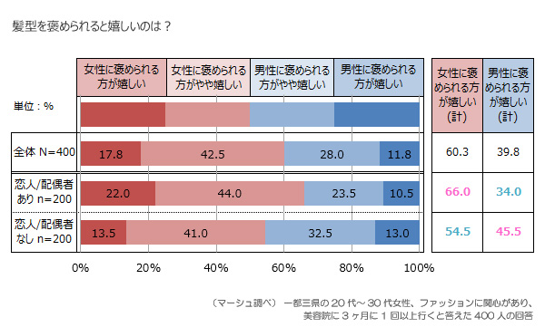 また、ヘアスタイルを変える時に意識することとして、「好きな男性の好み」を挙げる人は1割未満と、好意のある異性の意向に合わせる意識は極めて低い結果となりました。しかしながら、髪型を褒められて嬉しいのは女性よりも男性と答える人が全体で4割存在し、恋人/配偶者がいない女性では5割弱になっており、より異性を意識している様子が窺えます。