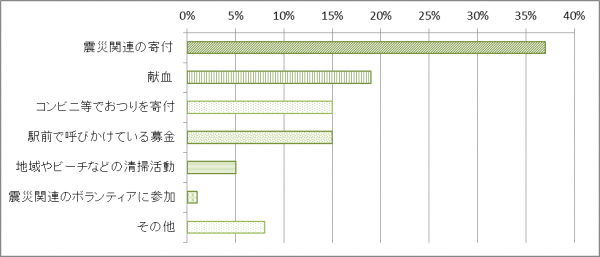 また、60%以上の方が震災前後で社会貢献に対する行動に変化があったと回答しました。寄付の他、割合は少ないですが、ボランティア活動に参加したりと、人々にとって行動するきっかけとなったようです。