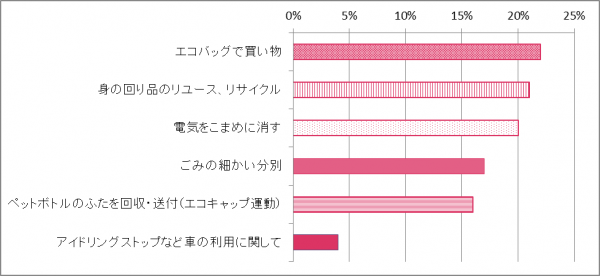 日頃心がけているエコとして最も多く挙げられたのが、「エコバッグで買い物をすること」ごみの分別や、電気をこまめに消すといった意見よりも多く、エコに対する意識のある方の中ではもはや常識となっているようです。