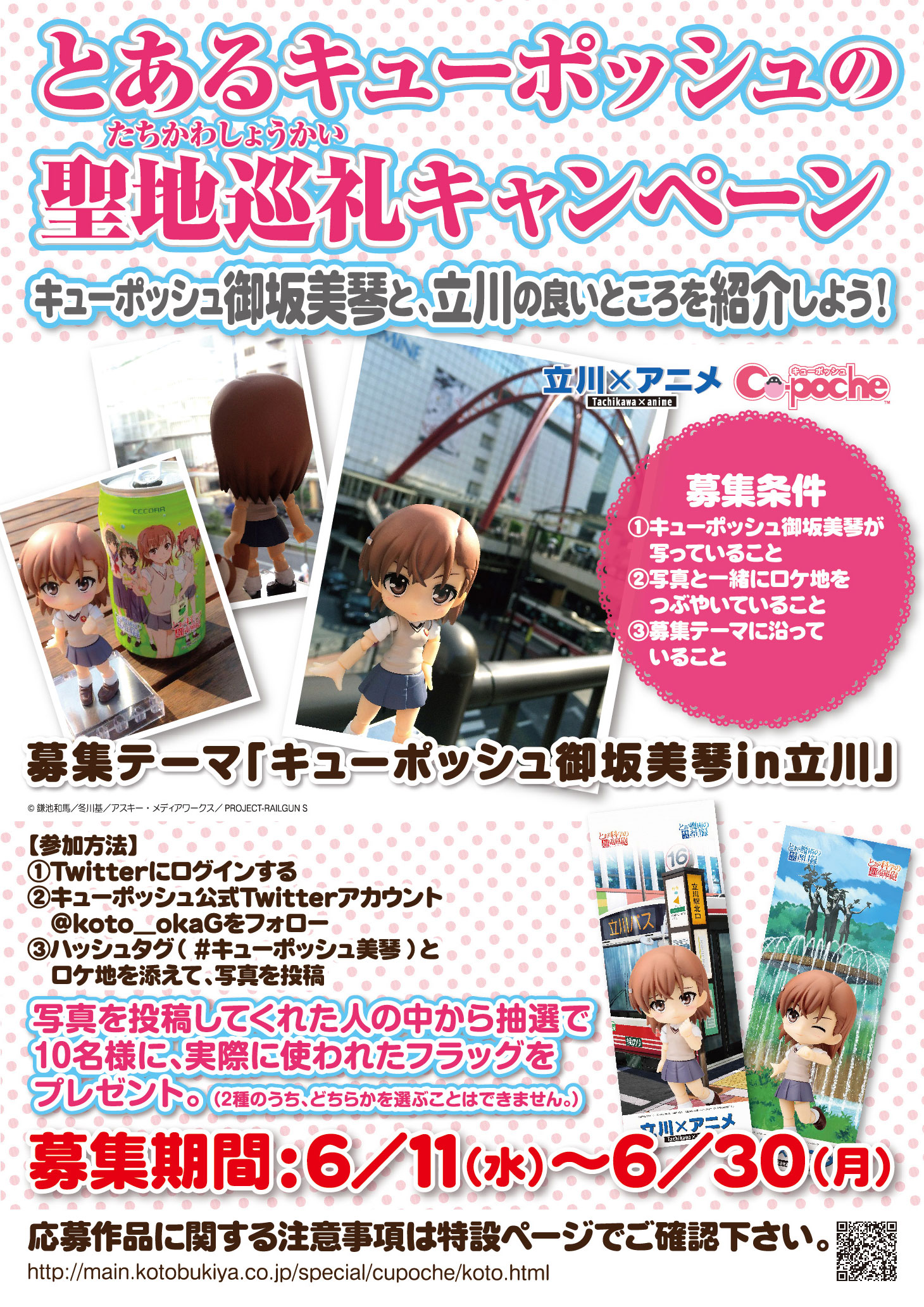 株式会社壽屋(本社:東京都立川市曙町/ 代表:清水一行)は、発売中の可動フィギュア「キューポッシュ 御坂美琴」を使って、立川のスポットを紹介する写真募集キャンペーンをtwitter上で開催します。テーマは「キューポッシュ 御坂美琴in立川」。立川の良いところを「キューポッシュ 御坂美琴」と一緒に撮影した写真を募集します。「キューポッシュ 御坂美琴」は、立川市のアニメ事業団体「立川×アニメ」の親善大使となっており、立川市内に展開するフラッグのイメージにも使用されています。投稿者には抽選で10名様に、立川市内で実際に使用された特製フラッグをプレゼントいたします。