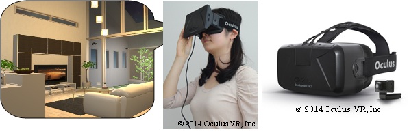 本システムは、HMDによって目の前に3D空間を仮想的に出現させ、センサーによって頭の動きに連動して視線を変えることで、“3D空間の中に自分が入り込んだ様な感覚が得られる”“空間の広がりや奥行き感を直接感じることができる”VR型の内装体験システムです。