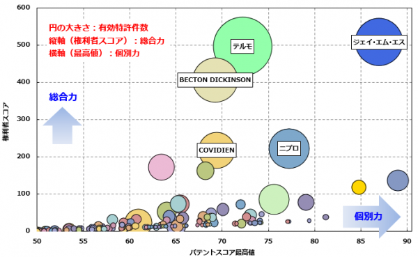 本調査では、チューブや注入針のみならず、コネクタ、流量可変器具、弁装置、活栓など付属装置を含む輸液・輸血セット関連技術に着目し、参入企業の競争力に関する調査を行いました。1993年から2014年4月末までに日本の特許庁で公開された関連特許3,324件を対象に、特許の質と量から総合的に見た「特許総合力ランキング」を集計しました。