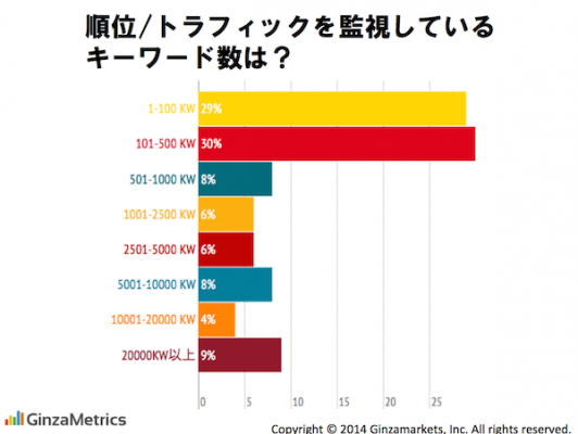 順位/トラフィックを監視するキーワード数の比率として高いのは、500キーワード以下で59%。その一方、ロングテールキーワードも含め5000キーワード以上みている企業は20%ある。