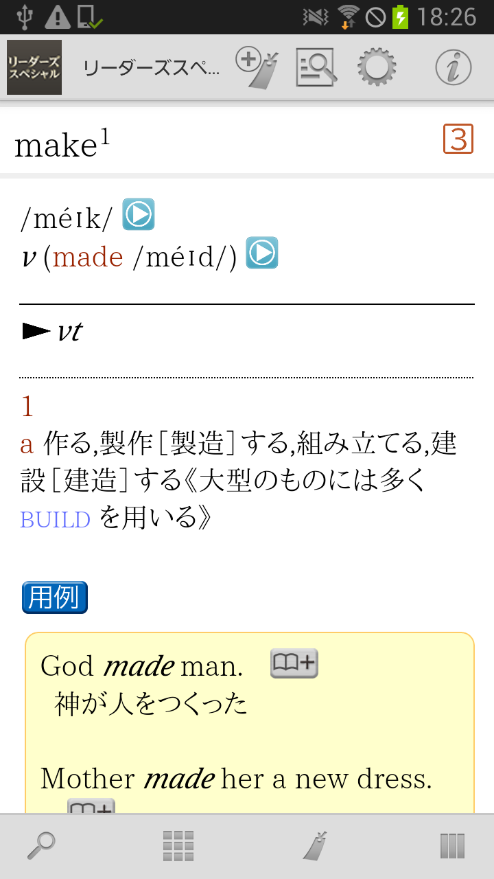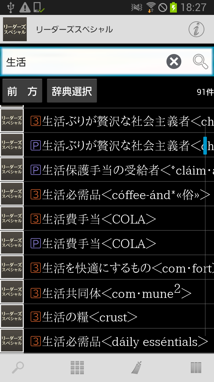 ・「リーダーズ英和辞典 第3版」「リーダーズプラス」をセット辞典として辞書引きすることができます。