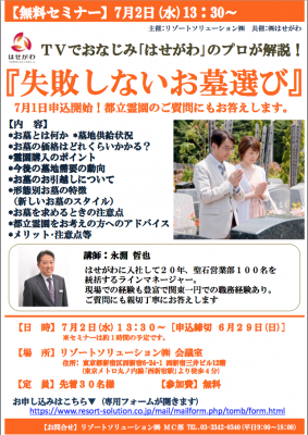 その一環として、来る7月2日(水)には、TVでおなじみの「(株)はせがわ」の永淵哲也さんを講師に迎え『失敗しないお墓選び』(下記参照)をテーマに無料セミナー(会場は東京・西新宿のリソル会議室)を開催いたします。
